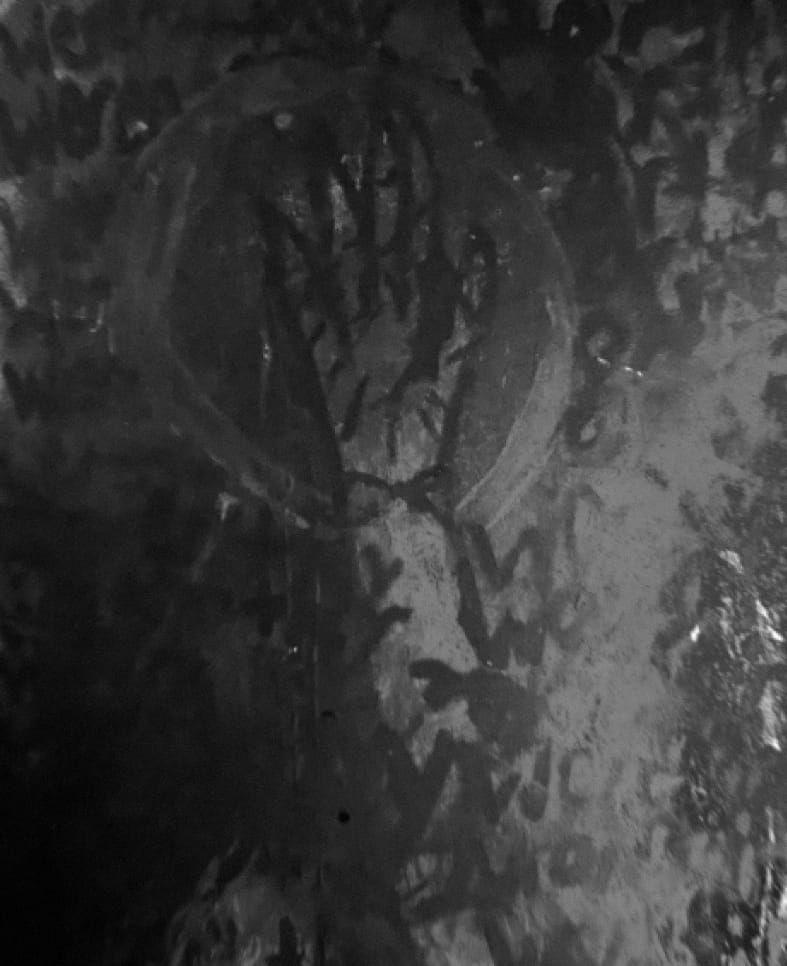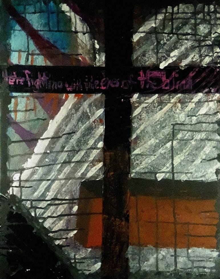 That aforementioned ur-painting of the head was actually done over two other scrapped pieces. The first (or maybe it was the second) was an experiment in drip and duct tape (I was obsessed with it) that I think is supposed to show a grave on the moon, with a roman cross reading “We’re fighting with the eyes of the blind” (another blatant lyric rip). The other painting showed a raised hand in a halo with repeated text reading (I think) “weren’t they worth it” that was clumsily meant to be commentary on extrajudicial killings. Both were technically completed, but they displeased me and I felt compelled to paint over them so their physical presence would not continue to disturb me. Here’s some photos of my bastards: